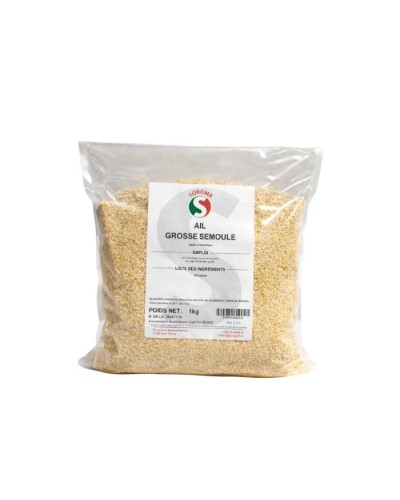 L’ail grosse semoule est obtenu par déshydratation de gousses d’ail (Allium sativum) puis concassé afin d’obtenir une granulométrie plus grossière. Cette texture permet une diffusion progressive de l’arôme et apporte une présence visuelle dans les préparations culinaires.